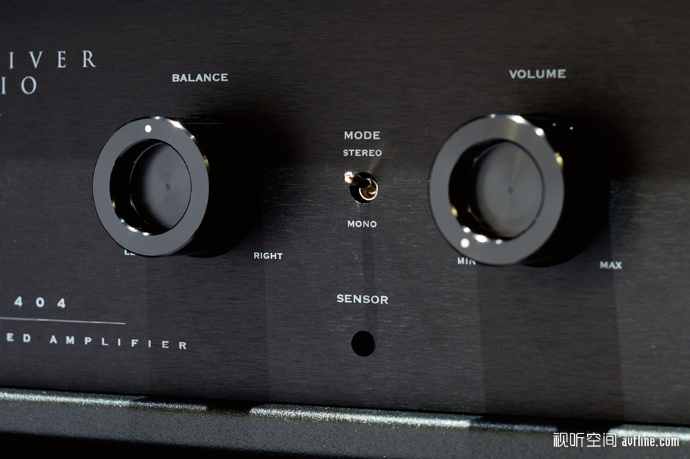 除了有着复古的外观之余,Model 404的前面板上的功能也是非常“复古”,除了电源开关、输入选择和音量控制之外,更加入了左/右平衡调整、立体声/单声道切换以及磁带监听。厂方在官网上特别介绍了这些功能的必要性:平衡调整功能,在很多用家的使用环境未必是对称的,可能不能提供理想的摆位以及聆听位置,从而影响立体声场的形成,因此平衡调整功能就能派上用场;立体声/单声道切换则用于满足聆听不同年代的录音作品,如上世纪60年代前的LP唱片则多为单声道录音,切换成单声道播放则能够消除立体声模式引起的人为相位差异;对于磁带监听功能,除了监听数码/模拟录音机录制的信号外,更可通过此功能外接诸如EQ均衡器、效果器、缓冲器等设备,满足各式各样的把玩需求。