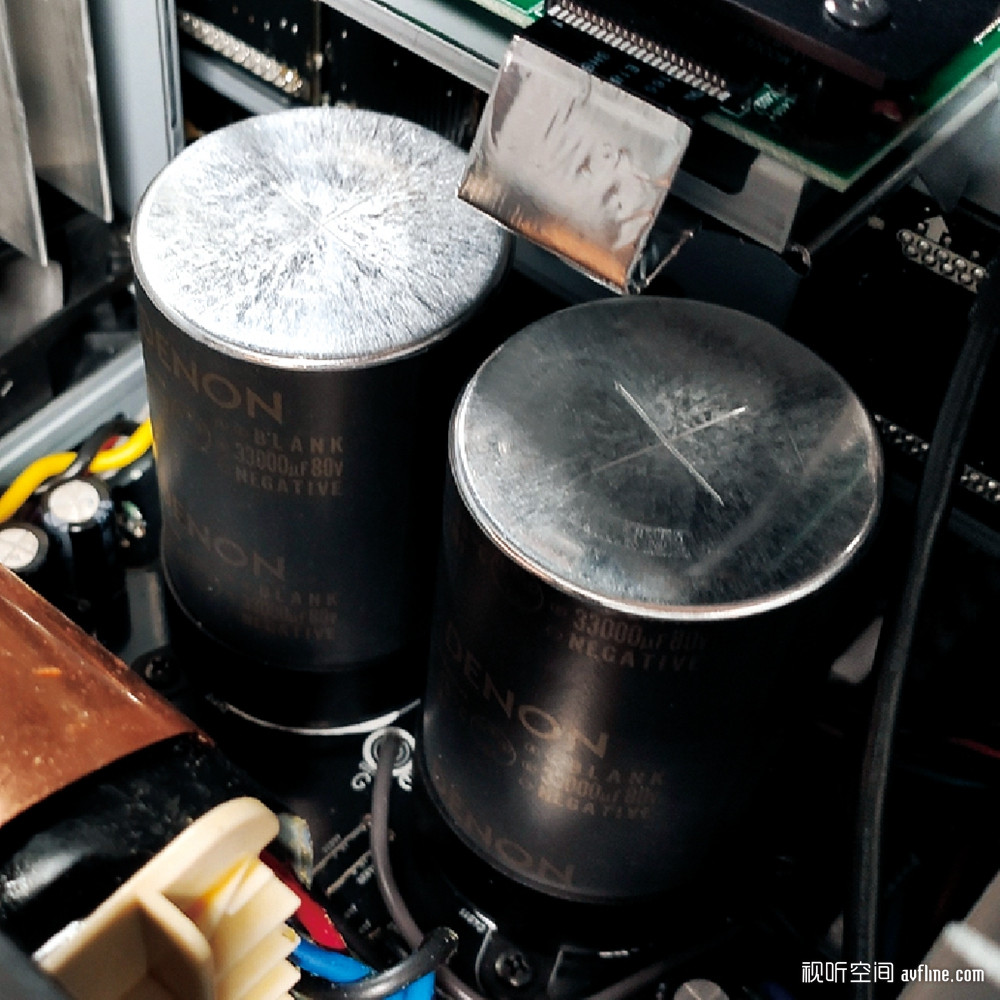 Denon对于旗舰产品十分严谨,要做到全面超越前作才算满意。AVC-A1H在功能、接口、音质上都比AVC-A110更进一步。外观上看起来,AVC-A1H还是保持Denon AV功放一贯的传统设计,但实际“上手”马上就发现不同——好沉。AVC-A1H重量高达32kg,如此份量自然是用料上乘。据Denon所说AVC-A1H使用全“Hi-Fi级别”的机械电子零部件。最显眼的莫过于透过散热口看到里面的大变压器和大电容了。Denon说过这是他们在AV功放中使用过最大的变压器,没有之一。坐落在2mm厚铜板之上的变压器重达11.5kg,比AVR-X8500H的变压器重41%,比整台AVR-X2800还要重。而那个漂亮的大电容是日本Nichicon定制的低感电解电容,每只容量达到33,000μF/80V,比AVR-X8500H和AVC-A110所用的22,000μF/80V电容也要大上不少。