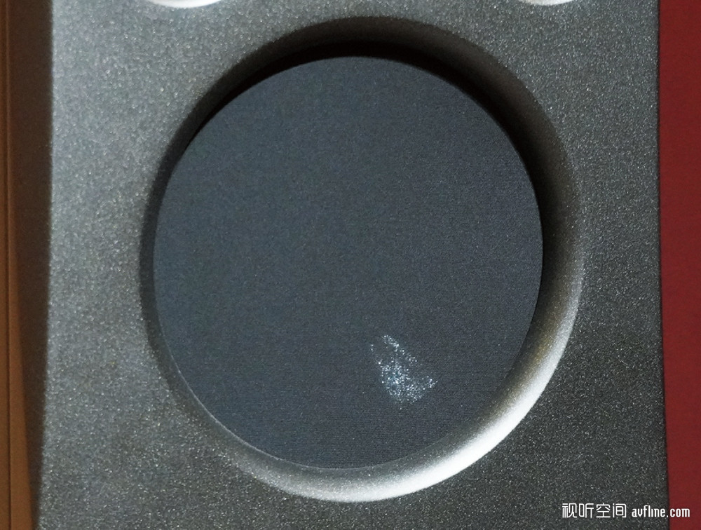 ◀ 前面板上方是号角中高音单元,下方是低音单元,而两单元之间是两个倒相孔。单元和倒相孔都由纱质网罩遮挡,因此不需要用另外的网罩来遮盖前面板了