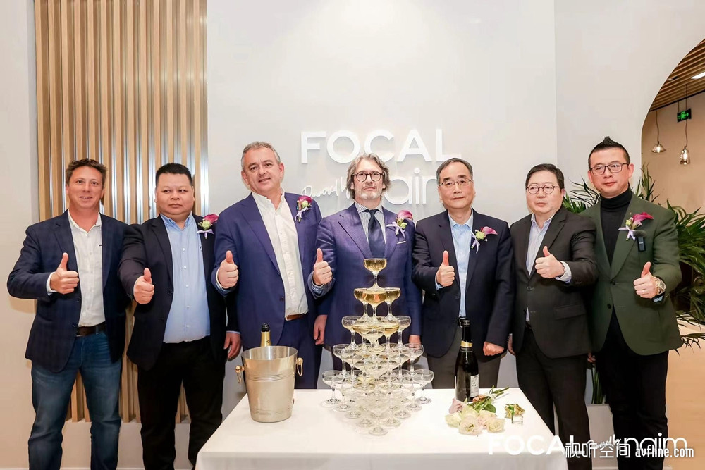 盛大的揭幕仪式上,Focal&Naim集团总裁Cédrick Boutonet先生、首席销售总监 Arnaud Hendoux先生与上海乐颂坊音响有限公司总经理吕朋山先生和广州域丰音响总经理高松盛先生共同出席剪彩活动并庆祝新店开幕。