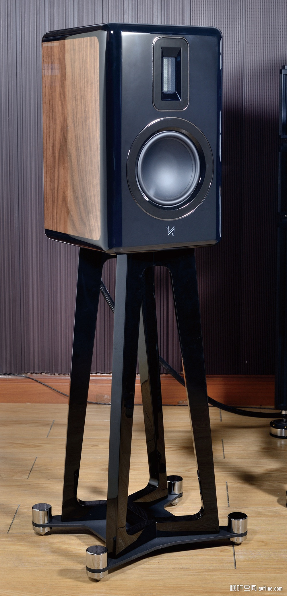 Revela 1书架箱还配有原厂脚架,它也是QUAD声学设计总监Peter先生定制设计的。支架是采用桦木胶合板钢琴漆立柱,高碳钢管底板和硬化的高碳钢底座钉。脚架是扁形的金属按力学原理构建成上窄下宽的造型,箱体和脚架都是抛光漆面,流畅精致,就像一位婷婷玉立的少女。