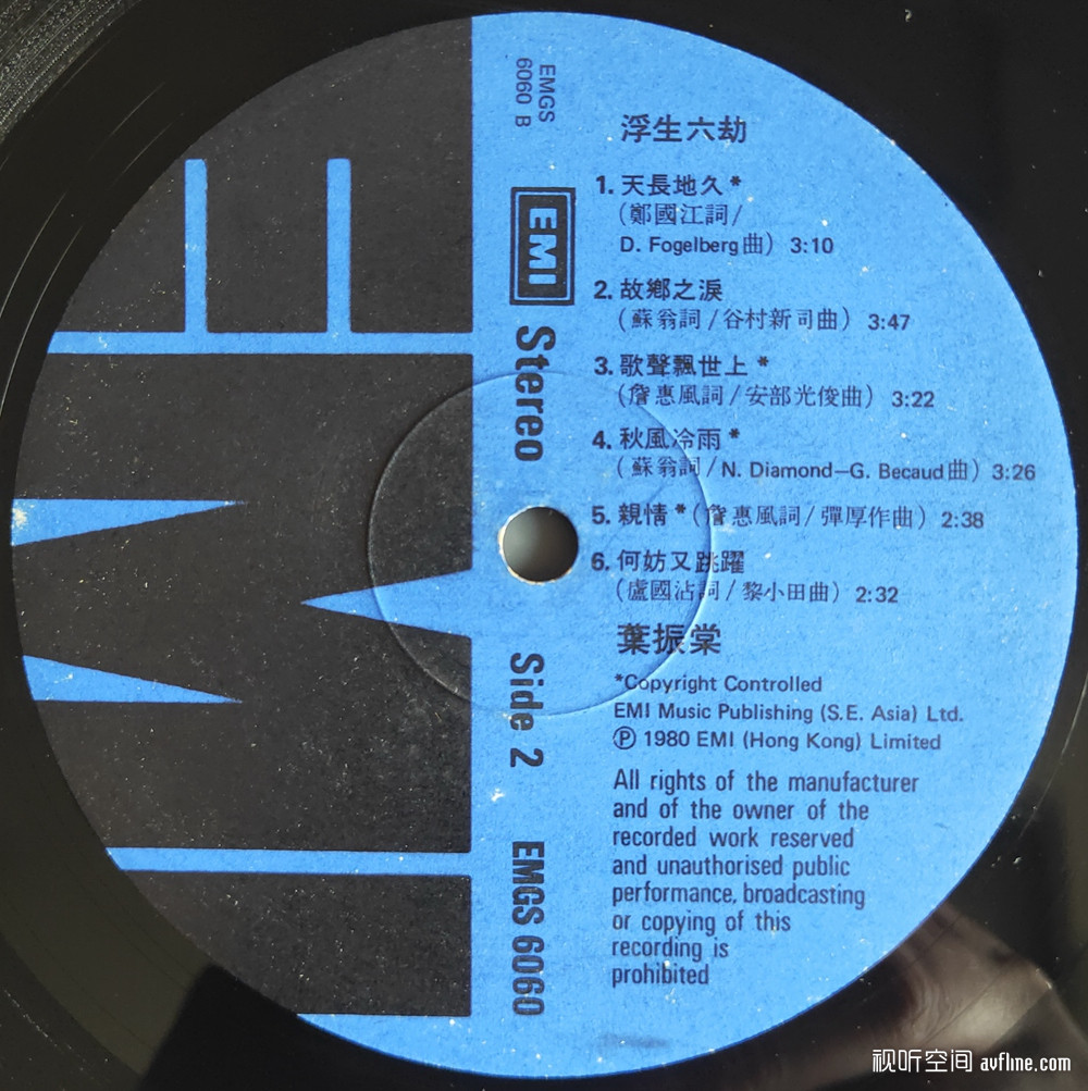 过去,音响档次一般,人们为着一首喜欢的流行歌曲购买一张唱片,即使音质一般也无所谓;现在,音响档次提高了,人们选择购买喜欢的歌曲且录音均不错的唱片,音质一般的多提不起兴趣去听;将来,随着音响设备档次不断提高,音质会越来越好,人们应会多购买录音优质的唱片,即使歌曲一般,可能也无所谓。这就涉及笔者此前早已提及的,我们究竟是听音响,还是欣赏歌曲的问题。也许,这就是音响界时常讨论的“音响性”与“音乐性”的辩证关系问题。最好的选择,肯定就是拥有一张既有喜欢歌曲且录音又不错的唱片。问题是,当下大多数唱片悉数翻唱非原唱,黑胶压制的声音大多也不如前。因此,音响或音乐发烧友自然就会选择原版原唱的黑胶了。其实,他们并不是坚定的怀旧者,而是在未有新的或更好的选择前,这是他们最明智的选择。况且,过去香港流行黑胶的录制质量并不差。就拿这张《浮生六劫》黑胶来说,青心版不但具有上世纪模拟录音时代的“老味”,又具有香港EMI录音室录音线条感清晰、层次感分明等特点,听落真有身处昨日、恍如隔世之感,而蓝心版体现的上述特点就稍弱。