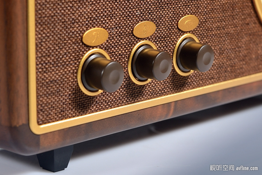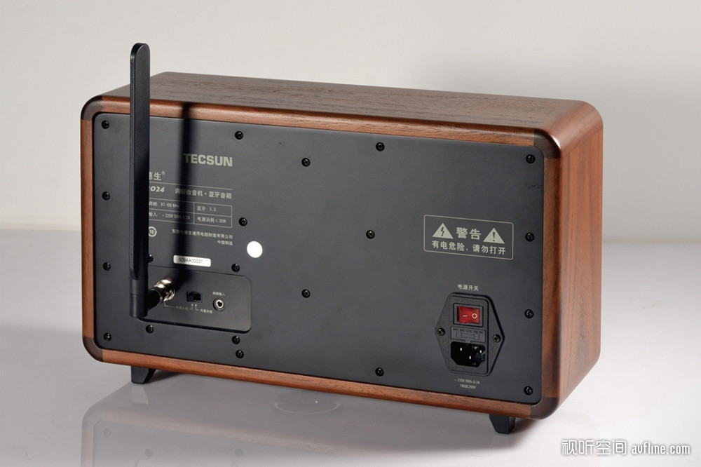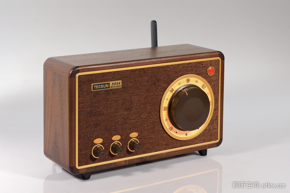 技术参数 ■ 收音机DSP芯片:SI4836 ■ 收音频率范围:FM 87MHz – 108 MHz ■ 蓝牙5.0芯片:AB5301 A ■ 喇叭单元:4寸低音、1寸高音 ■ 功放电路:NE5532 + LM1875 ■ 功放功率:15W ■ 尺寸:370 x 225 x 152mm只见这台R2024 30周年纪念版收音机采用实木外壳,前面板采用网布设计,左侧是喇叭单元的位置,下方设有音量和高低音调节,满足不同音乐节目的聆听需求。右侧则是大型的刻度盘和调谐旋钮,操作起来手感阻尼非常好,右上角则是电源开关和FM/蓝牙切换,整体设计非常简洁。后背方面,德生R2024 30周年纪念版收音机设置了外置天线的BNC接口、内置/外置天线选择、3.5mm线路输入以及电源插座和开关。