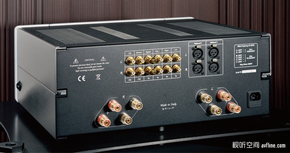 Unico 90 ■ 输出功率:100+100 W RMS(8Ω);180+180 W RMS(4Ω) ■ 输入阻抗:21kΩ/300pF ■ 输入灵敏度:860mV RMS ■ 输入级:纯A类设计,双ECC83与并联ECC81 ■ 输出级:恒温AB类扩大电路,每声道搭载3对HEXFET MOSFET晶体管 ■ THD:< 0.15% @ 1kHz,1W;< 0.50% @ 1kHz,10W ■ 功率消耗:550 W(8Ω) ■ 尺寸:43.5×18×44 cm ■ 净重:20kgUnico 90配置了3组非平衡输入接口和2组平衡输入接口,喇叭输出端子更支持Bi-Wiring驱动方式,大功率环形变压器供电加上充裕的100W(8Ω)输出能力,提供喇叭绝佳的驱动力,还支持超低音输出。另外,Unico 90还具备前级电路bypass功能,可作为一台纯后级融合到家庭影院系统使用。