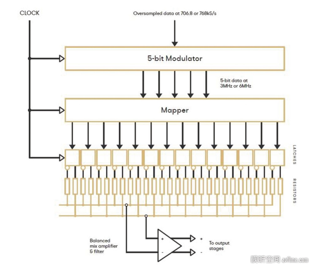 可能有读者会问,这不就是FPGA与R-2R的电路结构吗?当然不是,Ring DAC与R-2R架构的解码器在工作上有本质的区别。Ring DAC技术是将硬件和软件结合在一起,它处理的是数字主板处理过的信号。前两部分是软件处理,然后Mapper将信号分发到硬件部分,即许多数模转换单元上,这个过程并非随机分发,而是经过精确的计算来进行信号的分发,同时也会将多余的噪音滤除,让声音更干净更真实。
