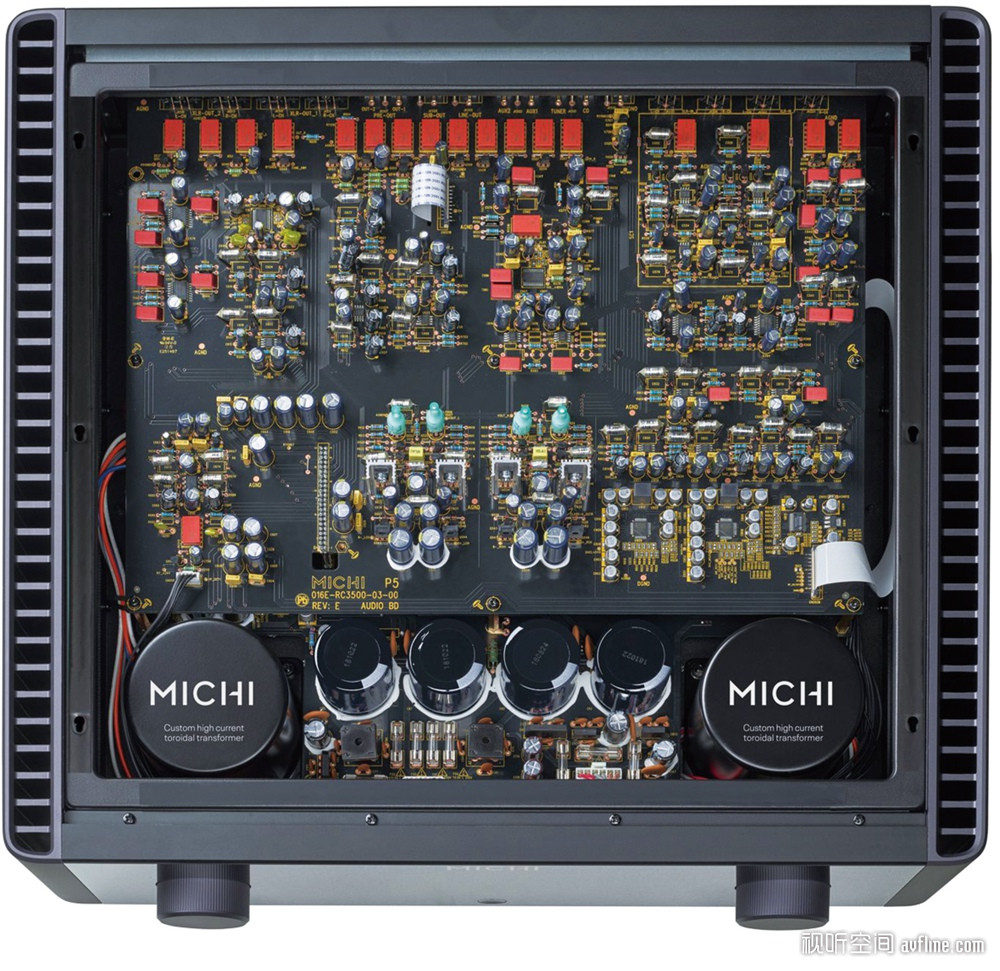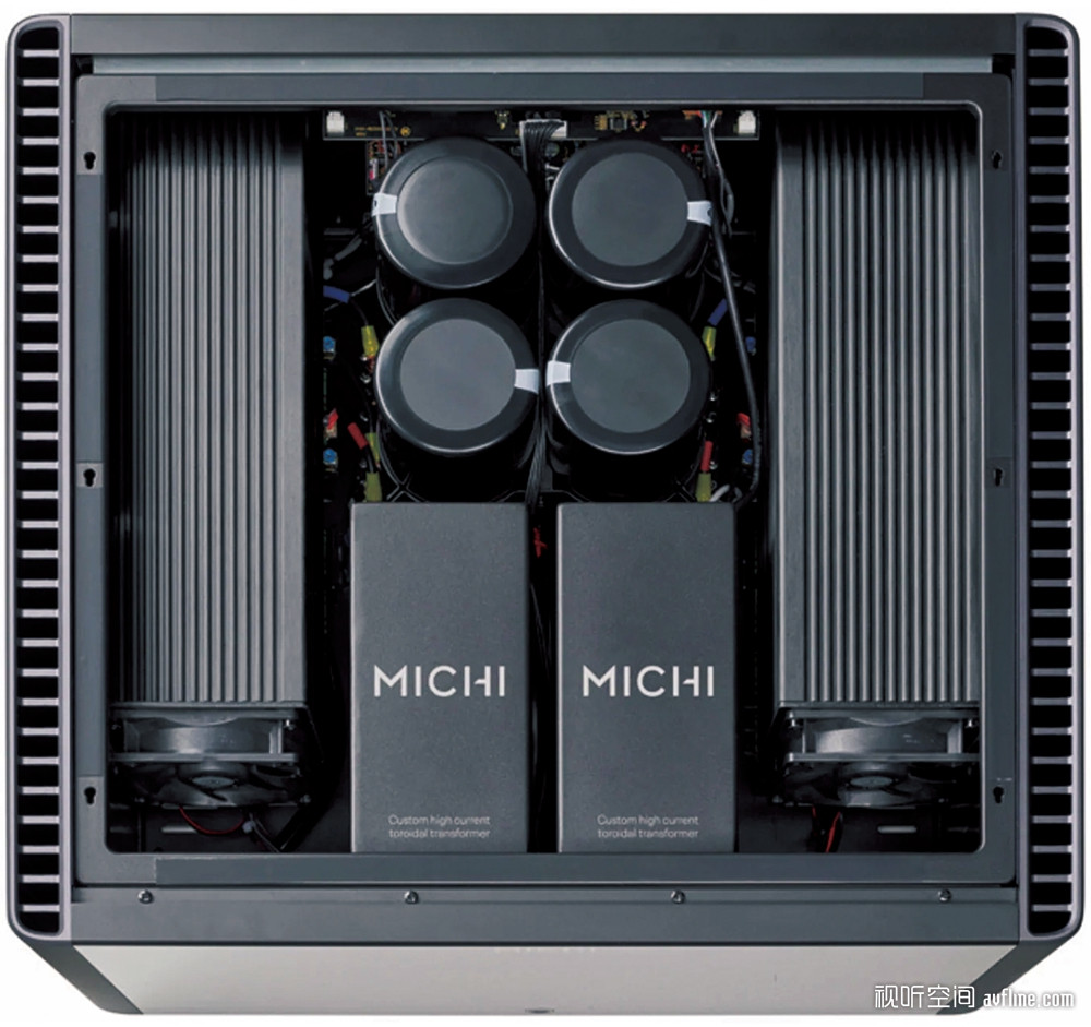 M8 后级基本参数 ■ 尺寸:485×238×465mm ■ 重量:59.1kg ■ 连续功率输出:1080W/Ch(8Ω),1800W/Ch(4Ω) ■ 总谐波失真(THD):<0.018% ■ 信噪比( A加权):120dB ■ 阻尼因数:200再看看P5 Series 2的好搭档,M8单声道后级推出至今一直是MICHI的“重磅”选手,59.1kg/台的十足份量表示了其内部用料之豪华。M8在8Ω条件下可提供1080W的AB类功率,推动4Ω音箱时可达惊人的1800W。M8配置了两只自制的低噪音环形变压器,加上4个英国特制的高效、低ESR、大容量slit foil电容支持,在极端负载条件下也能出色控制低音。为了获得最高精准度和最佳性能,M8配以一组32个高电流输出电阻阵列,减少各个单独部件的负载,同时所有关键部件的声学调谐搭配平衡电路设计,进一步提升音乐的表现力和细节。