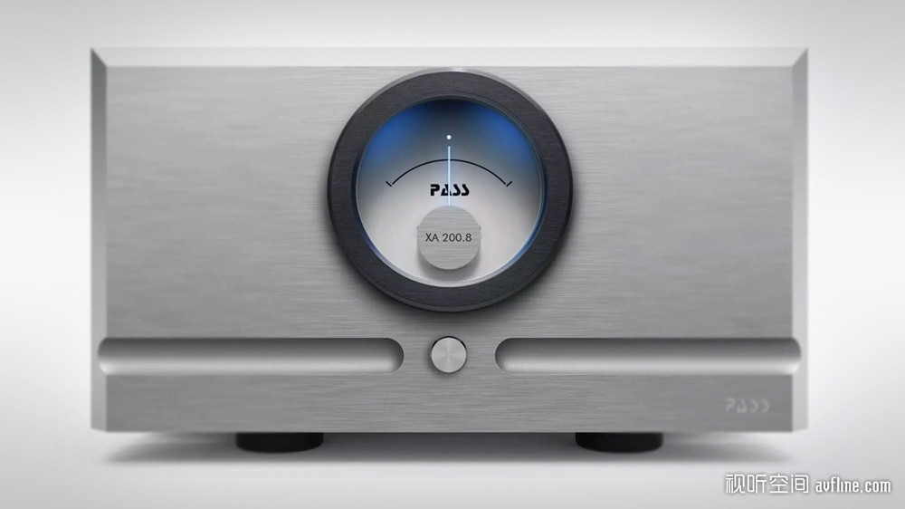 PASS XA200.8 单声道A类后级规格参数 ■ 类别:纯甲类(Class A) ■ 输出功率:200W(8Ω),400W(4Ω) ■ 频率响应:1.5Hz-100kHz ■ 失真度:1%(1kHz,全功率输出) ■ 输入接口:XLR×1(平衡输入),RCA×1(单端输入) ■ 增益:26dB ■ 阻尼因子:200 ■ 回转率:50 V/μS ■ 尺寸:19×27.5×11 英寸 ■ 重量:157磅XA200.8的外观设计简洁大气,厚实的铝合金面板上配有大型偏压表头,透出迷人的蓝光。通过现场的偏压表头显示来看,XA200.8处于高偏压的状态,而且在播放音乐时几乎没有变化,这就是纯A类的特点,无论音量多大,始终保持全功率运行的状态,以此来应对音乐的瞬变,因此其静态功耗达到760W的惊人程度。而两侧巨大的散热片正是为此而设,不仅具有散热功能,还增添了产品的视觉冲击力。