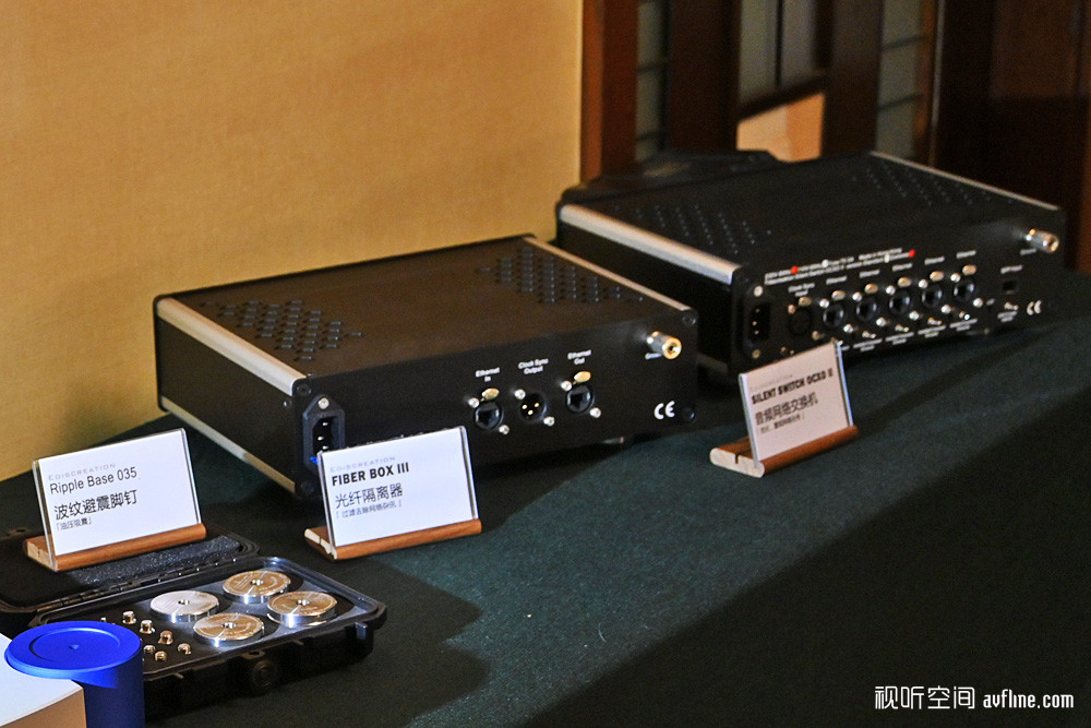 紧接着,隽丰数码又发布了Ediscreation品牌的SilentSwitch OCXO II音频网络交换机、Fiberbox III光隔离器和RippleBase035避震脚钉三款新品。