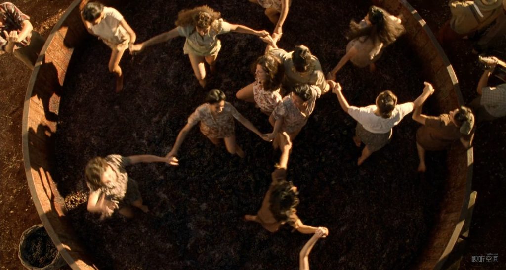 我们来欣赏丰收后踩葡萄那神圣与喜悦的场景:众人跳进一个大木槽中,随着欢快的音乐,赤脚踩踏葡萄,以最传统的方式榨取葡萄汁,用于酿造象征爱与希望的“天使之泪”葡萄酒。此时,《Crush The Grapes》华丽的管弦乐与热情的拉丁节奏交织融合,音乐节奏与踩踏的动作及欢笑完美契合,极大地增强了现场的狂欢气氛,将丰收的喜悦和人与大自然和谐的欢乐推向了顶峰。