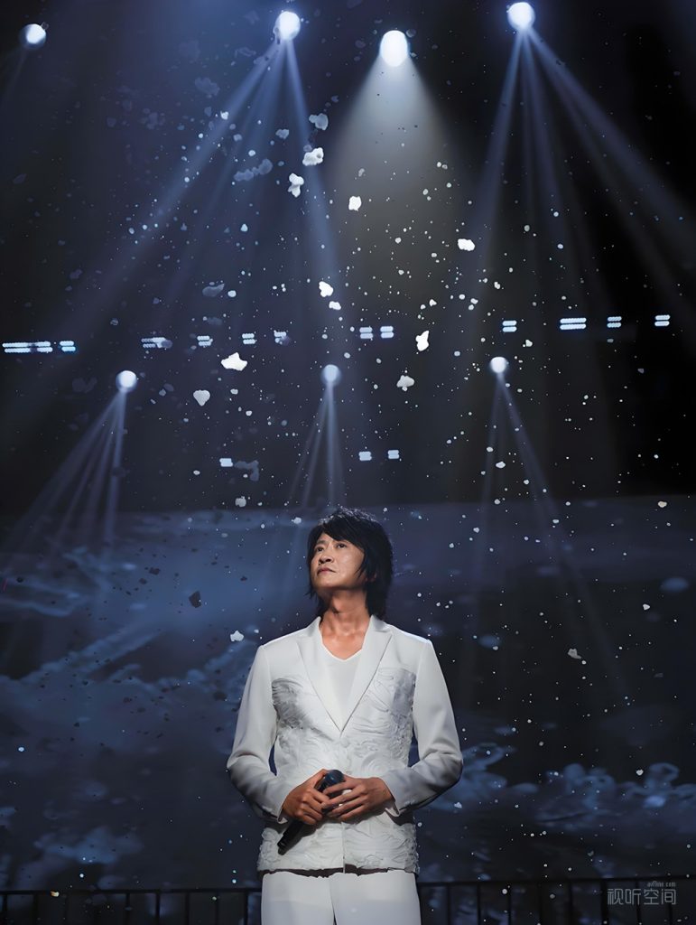 游鸿明以一首充满故事感的《寂寞化石》作为开场,当他标志性的磁性嗓音在空气中回荡,瞬间将观众穿越时光隧道,带入了他独有的音乐空间。那独特的“游式唱腔”,低沉而富有穿透力,每一个音符都仿佛带着岁月的痕迹,轻轻叩击着人们的心扉。在他的歌声里,我们仿佛看到了自己曾经的青春岁月,那些或甜蜜、或苦涩、或迷茫的情感经历,一一涌上心头。