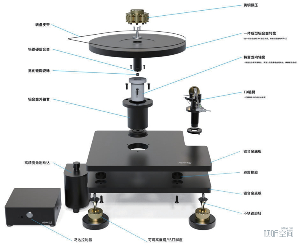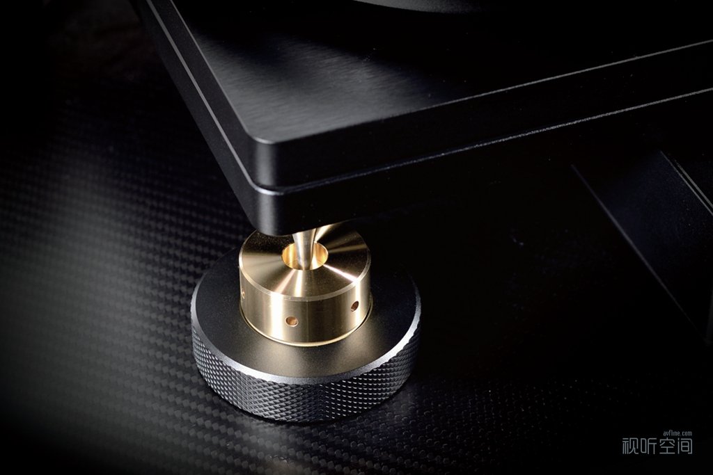 CP-1黑胶唱盘为软硬盘结合的设计,底座由两块厚达18mm的铝合金底板、中间以4块特制的避震橡胶组成,配以3个不锈钢脚钉和可调高度的铜/铝脚座,这样的设计既能通过自身重量抵御外部的振动,加入适当的阻尼又能避免了硬盘声音发硬的问题。黑胶唱盘的轴承可以说是其重要的根基,CP-1的铝合金外轴套安装在上层的底板上,内轴套为特富龙材质,由于特富龙自带润滑特性,而Vibrato更为其注入范登豪唱盘润滑油,因此摩擦系数极低。轴套底部放置了高硬度的氮化硅陶瓷珠,为其转盘提供良好的支撑。