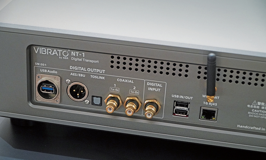 Vibrato by NSR的NT-1数字转盘是一款定位于高端市场的数字音频转盘播放器,专为追求极致音质的音响发烧友设计。外观方面,NT-1采用了航天级铝合金机箱,前面板只设有一块彩色显示屏用于展示正在播放的内容。后背方面提供了网线接口、2组USB 3.0接口可接驳U盘和移动硬盘等设备、1组同轴输入接口可用于MQA-CQ的解码;输出方面提供了1组经过隔离的USB音频专用接口、1组AES/EBU、1组光纤以及2组同轴。配备千兆有线网络接口和5GHz无线WiFi,支持NAS网络硬盘播放功能,内部设有M.2 (NVMe协议) SSD硬盘插槽,方便用户存储和播放大量音乐文件。