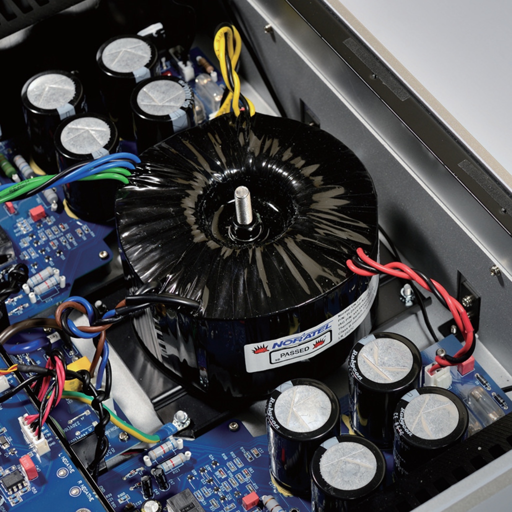 8500XP立体声后级放大器采用了全新的箱体设计,前面板的样式就像是增高了的9000P,也让8500XP从外观上能与7000、9000系列的产品完美匹配。机箱采用与旗舰9000系列相同的阳极氧化工艺,不仅具备卓越的耐用性与抗磨损能力,更通过氧化铝层提升散热性能并有效屏蔽电磁干扰,底部配备四组可调节橙色氛围灯,兼顾功能性与美学价值。核心组件全面升级,采用安森美MJL1302A/MJL3281A高性能晶体管,在50mA至5A电流范围内增益匹配精度误差小于10%,配合30MHz高截止频率确保信号精准还原;定制Noratel大功率环形变压器增加次级绕组,提升输出电压摆幅及电流能力;电源滤波升级为日本Rubycon 80V/10000μF低阻抗电容,每声道总容量达40000μF;音频耦合电容升级为日本NICHICON MUSE系列无极性电容,实现低损耗信号传输。