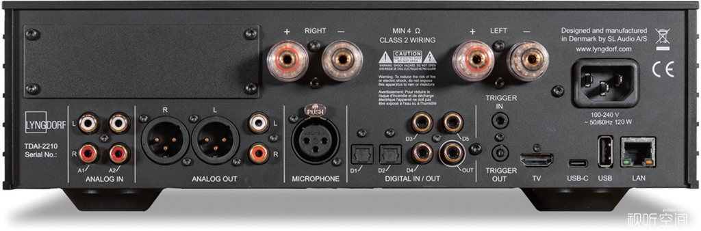 Lyngdorf TDAI-2210全数字串流合并式功放 ■ 功率输出:210W /4Ω、105W/8Ω ■ 最大输出电流:35 A ■ 频率响应:20 Hz – 20 kHz(±0.5 dB) ■ 总谐波失真:最大 0.05%(20 Hz–20 kHz)■ 数字输入:3 × 同轴、2 × 光纤、1 × USB-C、1 × HDMI 2.1(eARC) ■ 数字输出:1 × 同轴 ■ 模拟输入:2 × RCA、1 × 麦克风输入 XLR(用于 RoomPerfect™ 房间校准) ■ 模拟输出:1 × RCA、1 × XLR、1 × 3.5 mm 耳机输出 ■ 流媒体支持:Internet Radio(Airable)、Spotify Connect / TIDAL Connect、Roon Ready、Google Chromecast、Apple AirPlay 2、DLNA(UPnP)、本地文件播放(USB)、Bluetooth(BLE) ■ 尺寸:325 × 102 × 300 mm ■ 重量:约 4.8 kg