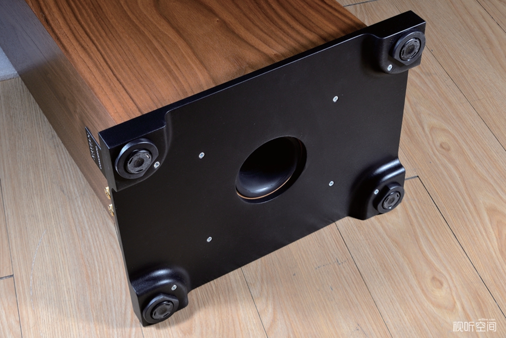 箱体底部的倒相孔正对地面,配合两侧带弧形通风口的高度可调底座,能将低频能量均匀扩散至四周,还能通过调节底座高度改变倒相孔与地面的距离,从而灵活调整低频的量感