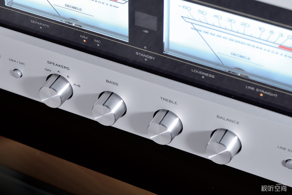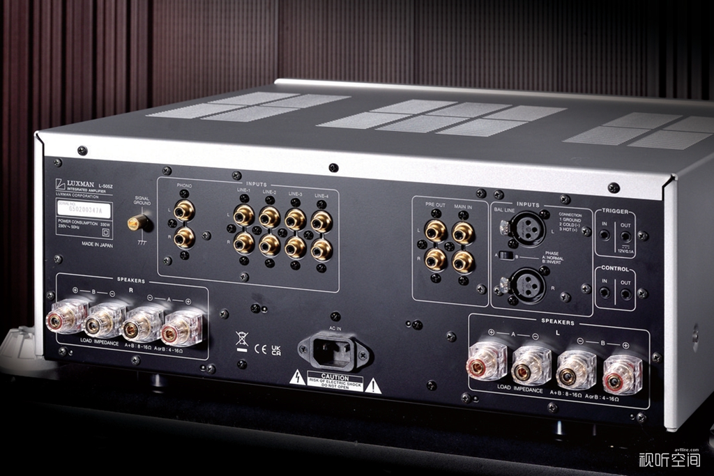 后背方面,L-505Z提供了4路RCA输入、1路黑胶唱盘输入以及1路XLR输入。厂方非常细心地在平衡输入的旁边设置了相位调整开关,以满足不同用家接驳不同器材的需求,并印上“1地2负3正”的标识,因此使用平衡连接时,大家需要花多一个心眼留意前端音源的输出相位。当然,使用LUXMAN同门的产品就不存在这个问题。输出方面,除了提供2组喇叭输出接口之外,更提供了前级输出和后级输入,方便用家接驳处理器或单独作前级/后级使用,用家只需要按下“Separate”按键即可切换。