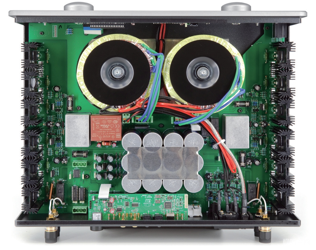内部用料至关重要。IN300 EVO使用两只440VA电源变压器,为双单声道设计。这意味着放大器的每个声道都有自己的独立电源,令声道分离度更好、串扰度更低。另外还有一个独立的10VA小变压器给数字板供电,以和模拟部分隔离开来。