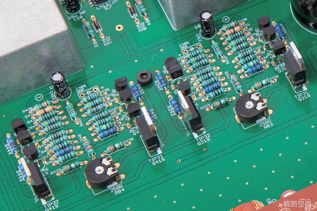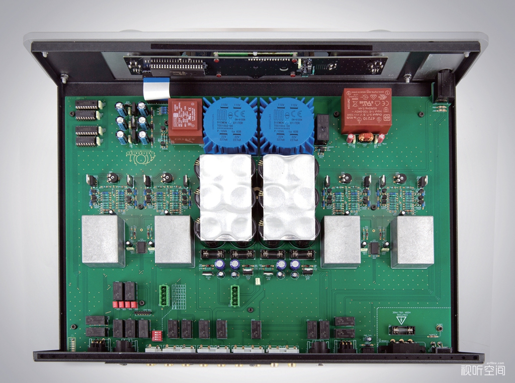 我觉得变化最大的是PR300 EVO前置放大器,与上一代的PR300 Signature相比不论线路还是用料都显著不同,完全可以看作是一个全新的设计,个人认为EVO这个后缀名并不足以描述两者之间的差异!在电源方面变化最大,PR300 EVO使用四个变压器。其中两个10VA、带有屏蔽罩的音频级环形变压器用于左、右声道放大线路。一个10VA的变压器用于逻辑控制电路,还有一个3.2VA的变压器用于数字电路部分。PR300 EVO所配置的滤波电容非常强大,容量竟高达 89000μF!对于一款前置放大器来说,如此庞大的电容配置显得太慷慨了,要知道89000μF这样的电容量用在一台200W/声道(8Ω)的功率放大器中也绰绰有余!如此重量级的供电系统能尽可能消除纹波,并提供深沉的低频冲击力。在放大线路方面PR300 EVO也有很大改动,线路板上明显可见四份同样的放大线路,为全平衡架构,这在之前的PR300 Signature是看不到的,里面装有Mundorf补品电容的金属盒也由之前的两个增加到了四个。PR300 EVO是彻彻底底的双单声道设计,从供电系统到放大线路均是如此,甚至是每个声道都有独立的音量电位器。而PR300 Signature是用了一只340VA环形变压器,滤波电容总量为6800μF。放大线路虽然也是双单声道架构,但没见像PR300 EVO那样的四份放大线路。经过这样改良后,PR300 EVO成为一款极其安静的前置放大器,据国外媒体报道:某款宣称拥有最低底噪的瑞士前级其噪声测量数据只比PR300 EVO低一点。但这款瑞士前级的售价是70000美元,而PR300 EVO只需3000美元!