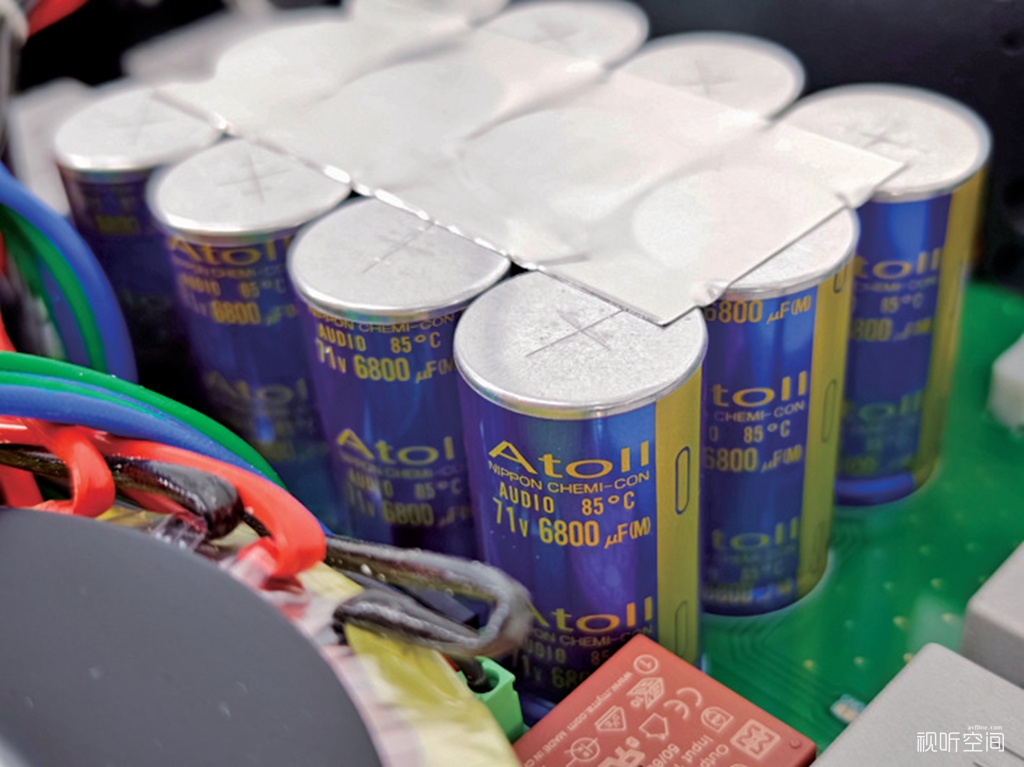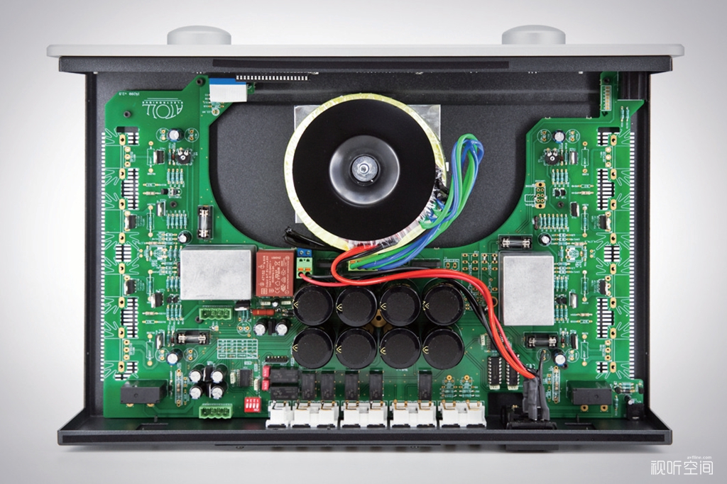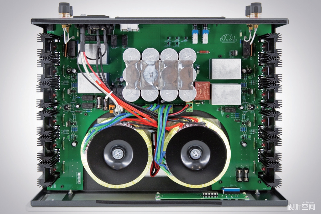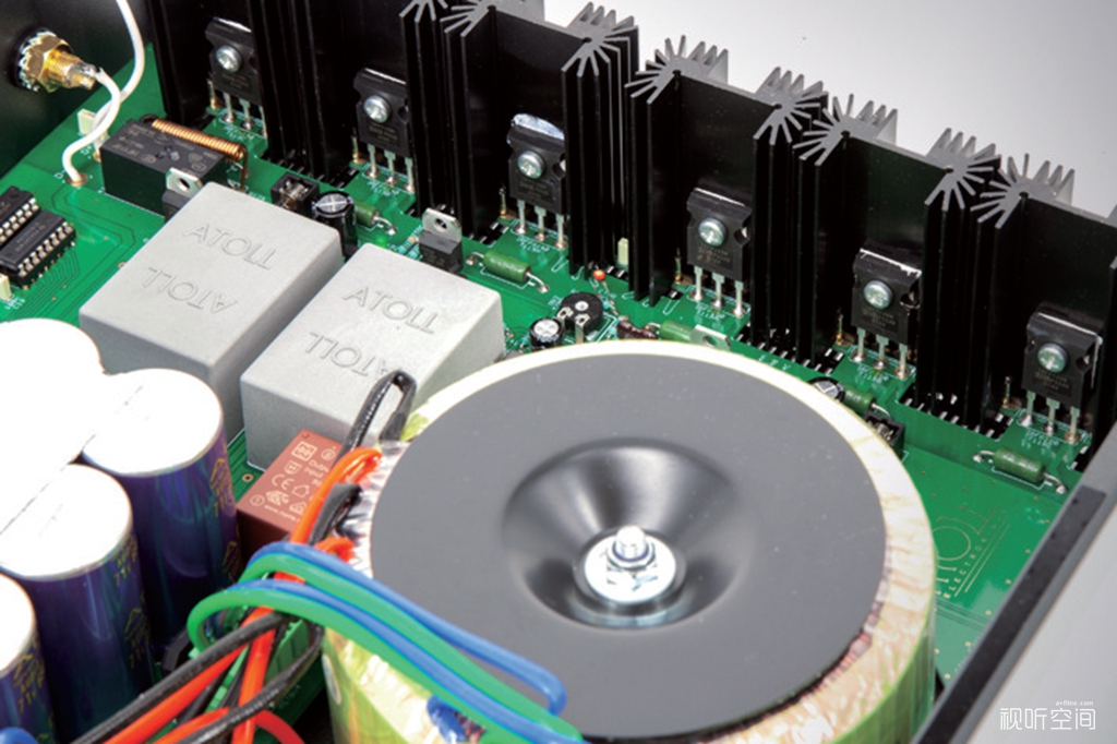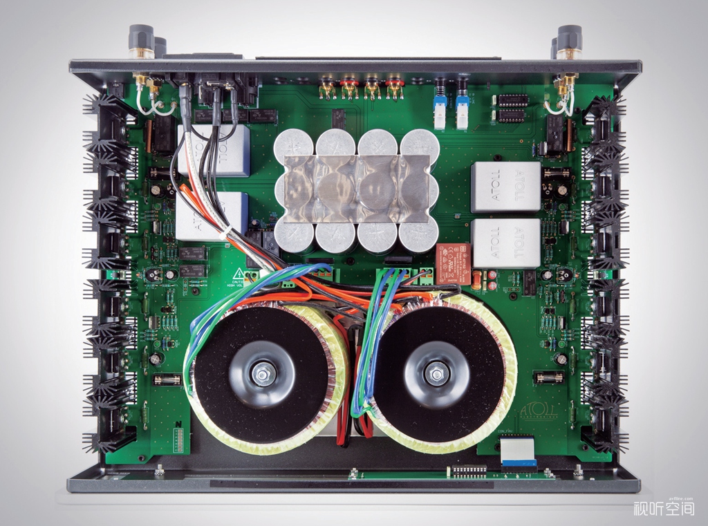 相比之下AM300 EVO功率放大器的改动要小一些,它同样是双单声道架构,每声道也是配置一只440VA环形变压器供电,此外还有一个5VA的小变压器专门用于逻辑控制部分。每声道3对MOS场效应管,也是获得150W/声道(8Ω)的额定输出功率。滤波电容总量为83600μF,略高于AM 300 Signature的83300μF。但这次ATOLL仍对AM300 EVO的电路板进行了重新设计,强化了热保护系统,并使放大器可以不受电容性负载的影响,从而确保无论搭配什么样的音箱都能保持良好的稳定性,即使在长时间、大电流输出的情况下。另外,AM300 EVO对各种噪声的抑制能力也更加出色,从而获得更高的讯噪比(105dBvs100dB)。