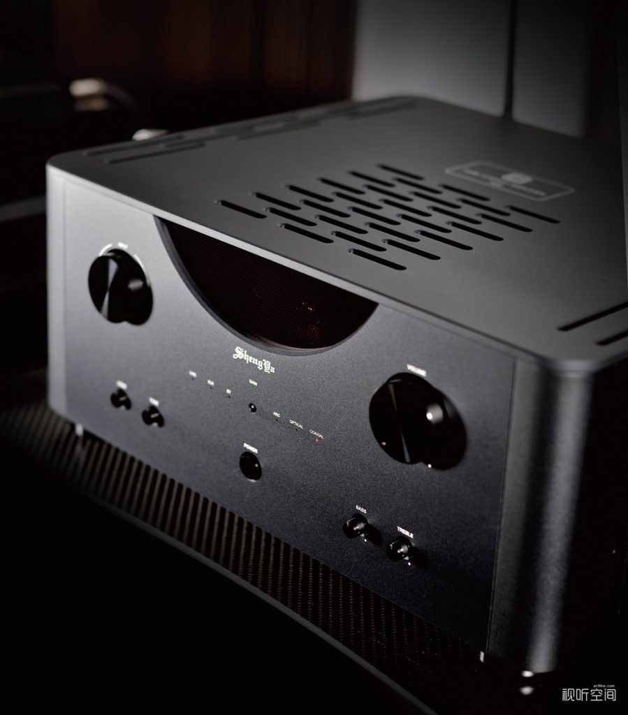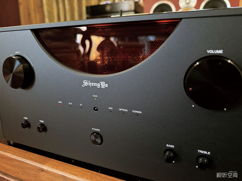 在笔者印象中,声雅的产品外型布局讲究平衡对称,这样的对称设计给人平稳的舒适感——音乐未起,心已平和。A33同样坚持声雅传统的对称平衡布局,正面半圆形的透明亚克力板可以看到机子内的电子管,开机后暖暖的电子管光线透射出来,平添一份优雅和惬意;左右布置的两个大旋钮分别负责输入选择转换和音量增减的控制,而最下一排按键中,除了居中的电源开关键外,左边的两颗分别是GAIN(增益控制功能)和LOUD(等响度功能),右边两颗分别是TONE(高、低音音调调节功能),这些附加的功能对于很多发烧友来说相当实用,用家可以针对自己搭配的器材或者听音环境启动这些功能,可以获得事半功倍的效果;值得一提的是,等响度功能很实用,用家可以在小音量聆听音乐时启动,能够获得相当好的高、低音补偿效果,令听感舒适满足。