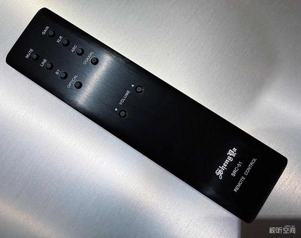 另外,A33随机配有一个金属遥控器,以铝合金板块镂空而成,面板经过拉丝处理,侧面进行了圆弧过渡,工艺细腻;遥控器整个形体大小合适,握感、操作相当舒服,功能包括了输入选择控制和音量控制,可谓“一切尽在掌握之中”。