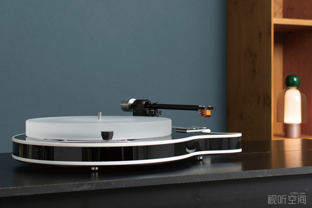 唱盘最核心的设计亮点,无疑是其完全复刻经典电吉他轮廓的机身,这一设计灵感直接来源于Al Di Meola舞台上标志性的Les Paul Custom吉他,机身采用高密度木纤维材质打造,这种材质经过特殊工艺处理,兼具高刚性与低谐振特性,既能精准呈现电吉他流畅的曲线与对称结构,又能有效抑制机身内部谐振,避免装饰性设计对音质造成损耗。机身提供两种经典配色:优雅的亮黑色采用特殊塑料贴面工艺,质感细腻且耐磨,适配现代简约家居风格;奢华的真玫瑰木贴面则保留了木材自然温润的纹理,呈现高级哑光质感,更显复古与艺术气息。机身侧面低调印有“Al Di Meola”签名标识,底部配备三个可调节高度的防滑减震脚垫,不仅确保唱盘放置平稳,还能进一步隔离地面震动,为纯净音质奠定基础。整机尺寸为460×360×140mm,重量约10kg。操控区设计更是将吉他元素与实用功能完美结合,正面标志性的“吉他音量旋钮”被升级为多功能触控旋钮,短按可启动唱盘并切换33⅓RPM与45RPM转速,长按进入待机模式。校准模式下旋钮还能微调转速,旋钮表面纹理细腻,搭配侧边LED指示灯,操作直观且充满情怀。机身背部布局简洁,镀金接口减少信号传输损耗,全球通用电源适配器则适配不同地区使用需求。作为限量收藏款,每套唱盘均附赠专属编号的Al Di Meola经典专辑《Elegant Gypsy》180克粉色限量黑胶唱片,以及一枚定制吉他拨片,唱盘与唱片编号一一对应,进一步提升收藏价值。