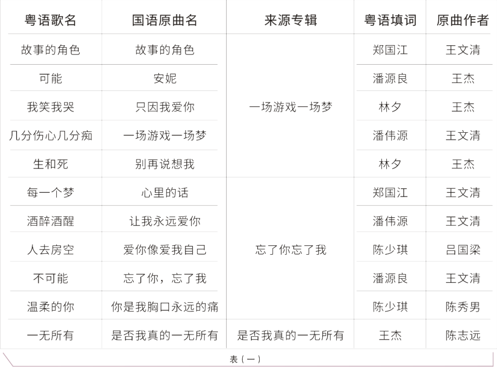 1989年,飞碟唱片公司精选在台湾发行的《一场游戏一场梦》《忘了你忘了我》《是否我真的一无所有》三张国语专辑的11首歌曲,重新填入粤语歌词,在香港推出王杰首张粤语专辑《故事的角色》。粤语歌曲与国语歌曲对比关系如下页表(一)。