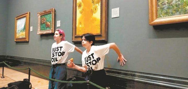 北京时间10月14日,两位20岁上下的英国女子,在众目睽睽之下,将忽然打开的番茄酱罐头泼洒在英国国家美术馆展出的梵高画作《向日葵》上,并跨进护栏内将手贴在墙壁上,大声表达石油对气候带来不良影响的不满,并发问 …